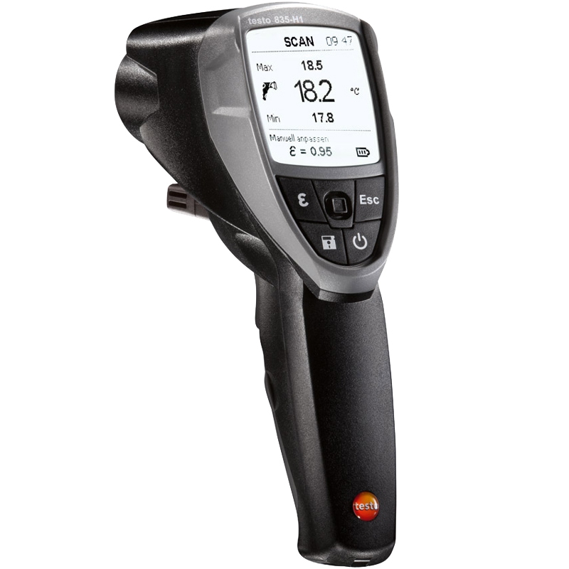 Testo 835-H1 - специальная модель инфракрасного термометра с интегрированным измерением поверхностной влажности. Воспользуйтесь уникальной запатентованной функцией измерения поверхностной влажности для своевременного выявления участков, подверженных риску образования плесени, измерьте влажность или определите удаленность от точки росы.